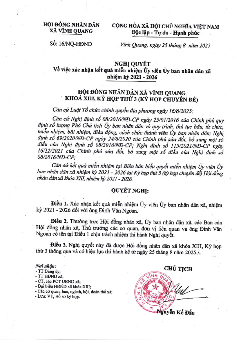 Tiêu đề văn bản | Nghị quyết về việc xác nhận kết quả miễn nhiệm Ủy viên Ủy ban nhân dân xã nhiệm kỳ 2021-2026 | ||