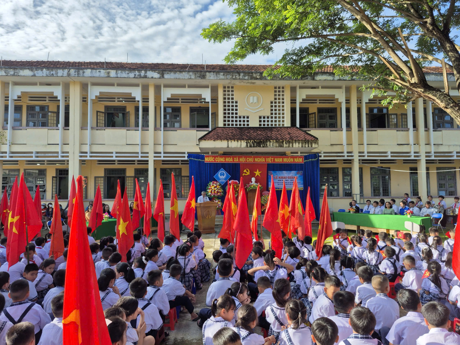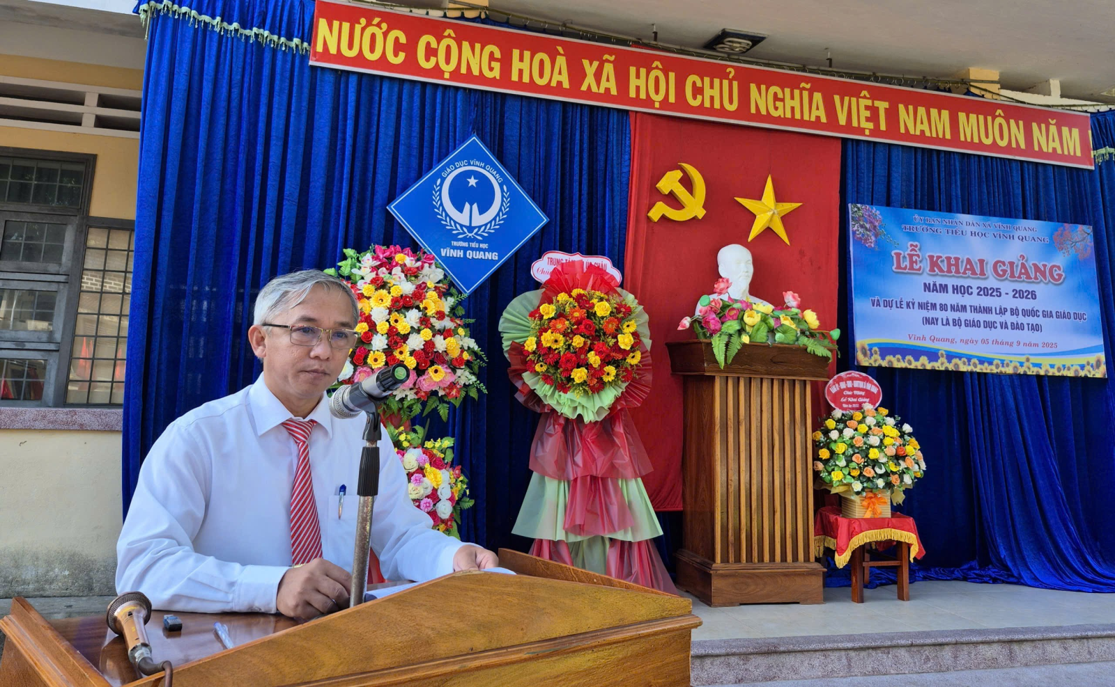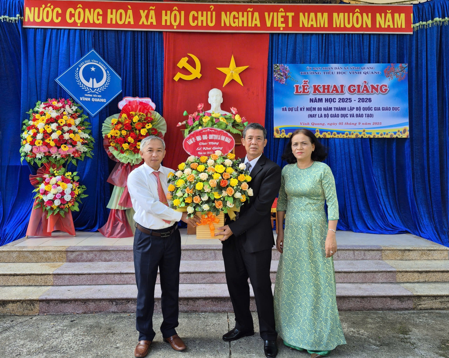Chúc mừng thầy và trò Trường Tiểu học Vĩnh Quang bước vào năm học mới 2025-2026, Phó Bí thư Đảng ủy, Chủ tịch UBND xã Trịnh Thành Trung tặng lẵng hoa chúc mừng của Đảng ủy, HĐND, UBND, UBMTTQVN xã cho thầy và trò Trường Tiểu học Vĩnh Quang. Đồng chí đánh giá cao và biểu dương những kết quả đạt được của nhà trường trong năm học qua. Đồng thời nhấn mạnh một số nhiệm vụ trọng tâm nhà trường cần quan tâm thực hiện trong năm học mới đó là tiếp tục đổi mới căn bản, toàn diện giáo dục và đào tạo gắn với phát triển nguồn nhân lực trẻ, chú trọng giáo dục toàn diện cả về tri thức, kỹ năng, đạo đức, lối sống và tinh thần cống hiến cho Tổ quốc, quê hương.
